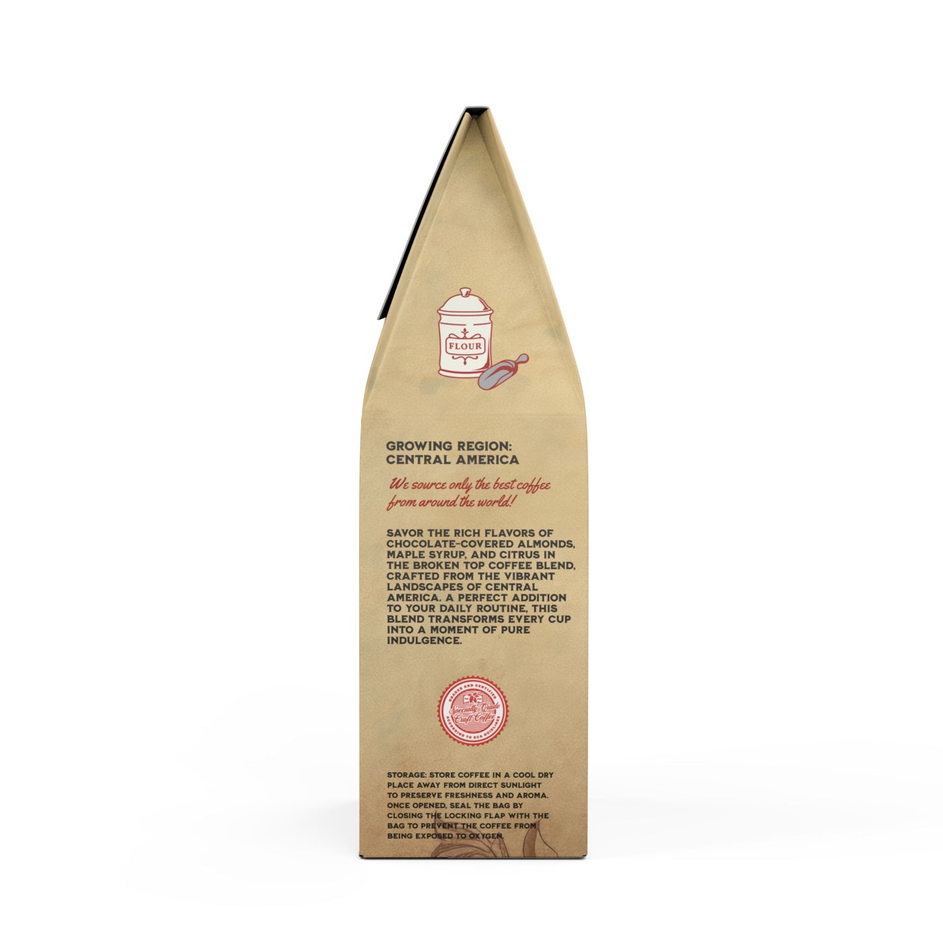 Indulge in the delicious notes of chocolate-covered almonds, maple syrup, and citrus, sourced from the vibrant region of Central America with the Broken Top Coffee Blend; the delightful addition to your daily routine. This 12oz pack features ground coffee or whole beans (up to you!) that are sourced from Central America. Roasted with care in the USA.