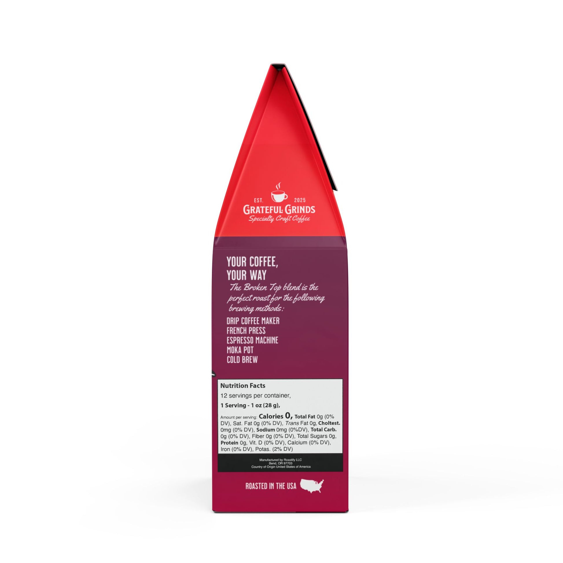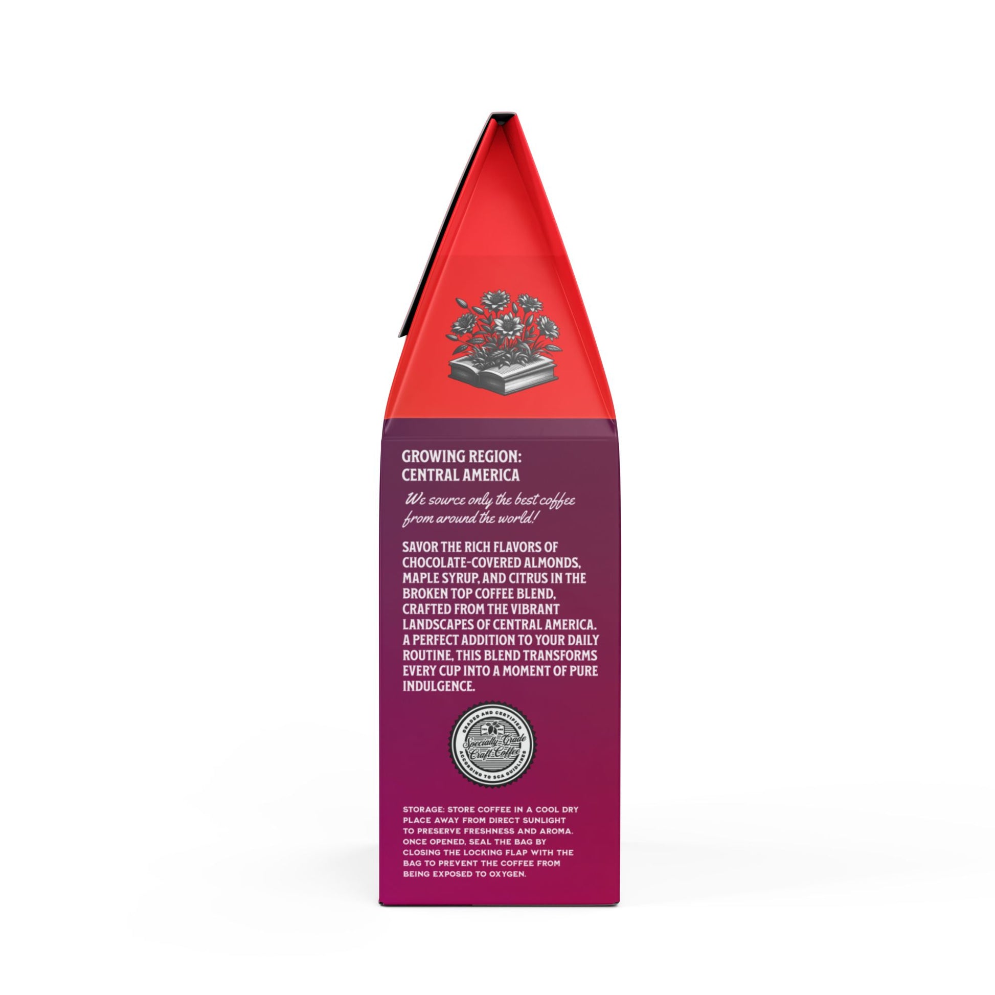 Indulge in the delicious notes of chocolate-covered almonds, maple syrup, and citrus, sourced from the vibrant region of Central America with the Broken Top Coffee Blend; the delightful addition to your daily routine. This 12oz pack features ground coffee or whole beans (up to you!) that are sourced from Central America. Roasted with care in the USA.