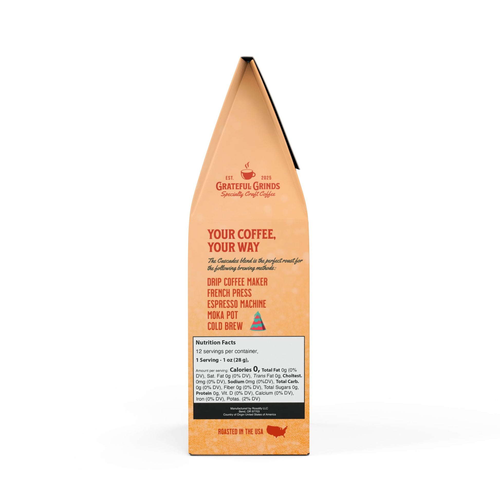 Grateful Grinds partners with Roastify for production. Roastify nurtures relationships with coffee farmers, ensuring they receive fair wages. They make sure to support sustainable agricultural practices.