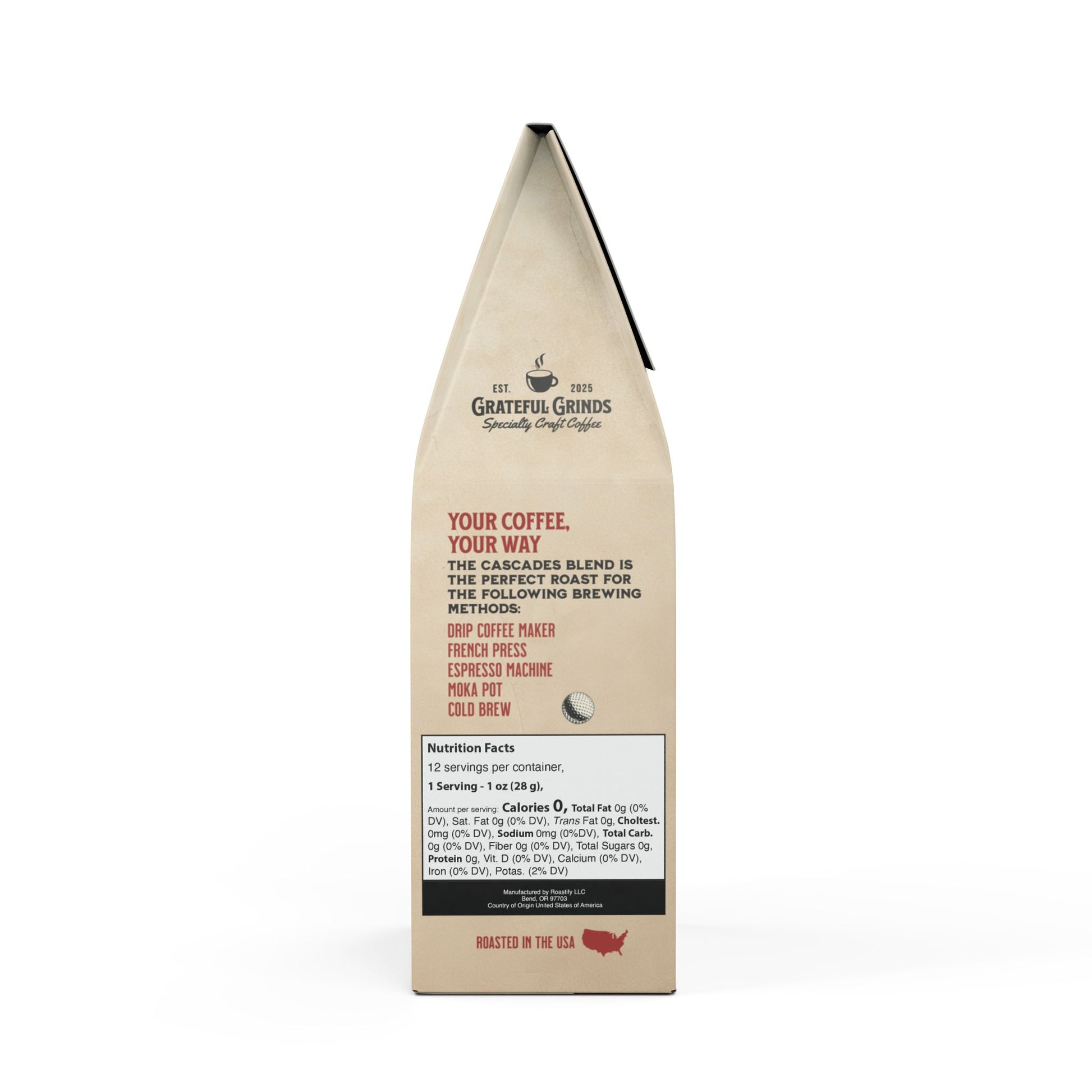 The Cascades Coffee Blend delivers a rich and robust delight for your mornings. Packed in a 12oz bag, this medium-dark roast boasts flavors of cocoa and toasted nut, offering a full-bodied experience with each sip. Sourced from South America, this blend is the perfect choice for brewing it in your drip coffee maker, Moka pot, or percolator. And with both whole bean and ground options available, you're in control of your coffee experience. Roasted with care in the USA.