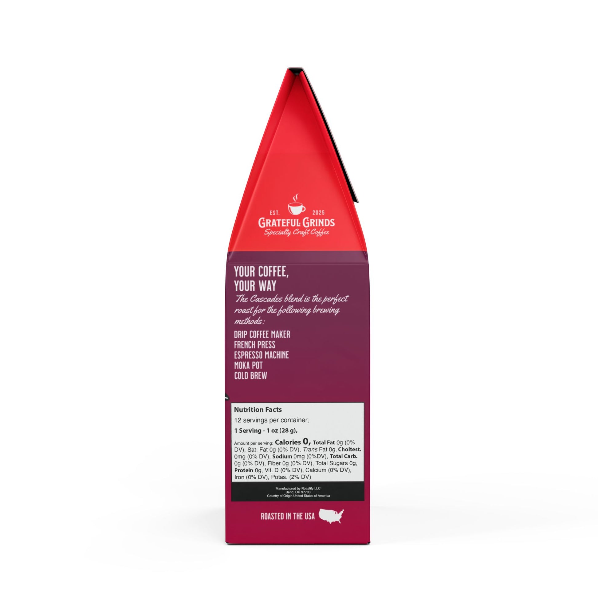 The Cascades Coffee Blend delivers a rich and robust delight for your mornings. Packed in a 12oz bag, this medium-dark roast boasts flavors of cocoa and toasted nut, offering a full-bodied experience with each sip. Sourced from South America, this blend is the perfect choice for brewing it in your drip coffee maker, Moka pot, or percolator. And with both whole bean and ground options available, you're in control of your coffee experience. Roasted with care in the USA.