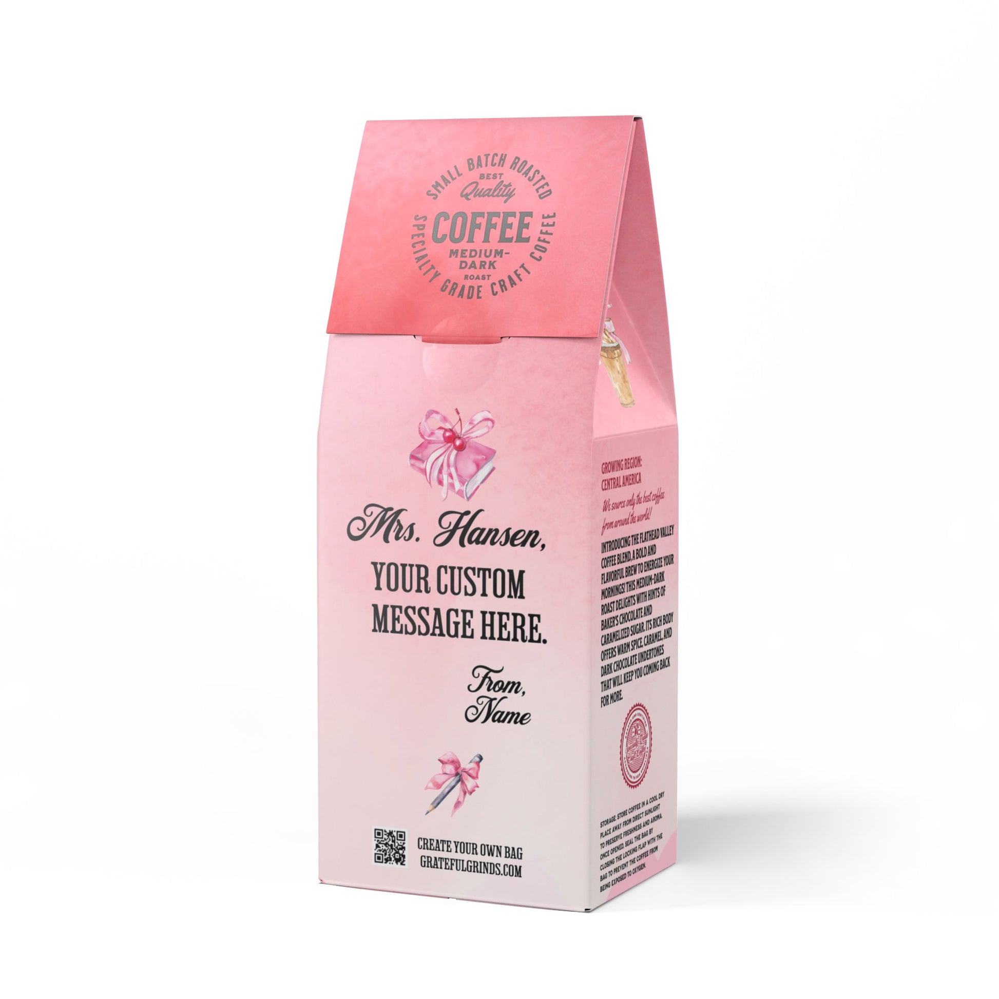 Think of the packaging as your own custom greeting card. Your recipient's first name will be personalized on the front of the package (ex. Amanda's Flathead Valley Blend). The back of the packaging will have a personal message from you, and your signature.