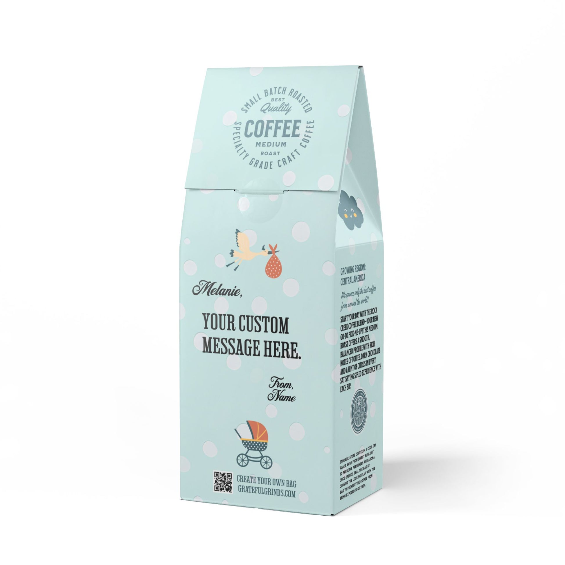 Think of the packaging as your own custom greeting card. Your recipient's first name will be personalized on the front of the package (ex. Amanda's Rock Creek Blend). The back of the packaging will have a personal message from you, and your signature.